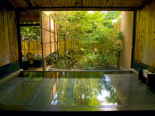 Onsen (温泉): a diferença para o sento é que as fontes de água são termais. Podem ser piscinas naturais ou não, ou até mesmo banheiras, desde que a água usada para abastecê-las seja naturalmente quente (acima de 25 graus). É possível desfrutar de um onsen num ryokan, a típica hospedagem japonesa, onde você pode pernoitar. Ou você pode ir em uma das diversas opções de onsen que existem no Japão para passar algumas horas e relaxar. Por se tratar de fontes naturais, esses complexos ficam em lugares mais afastados do centro das cidades, no meio da natureza, o que garante um cenário incrível para esta experiência.